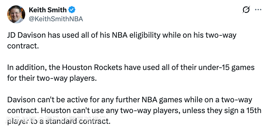 北京时间4月7日,据美记Keith Smith报道,JD-戴维森在双向合同期间,已经用完了他所有的NBA出场资格,此外,火箭也已经用完了给双向合同球员的15场比赛出场额度。