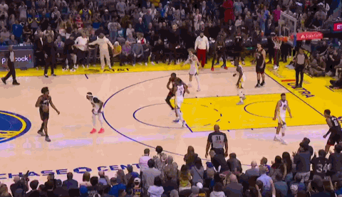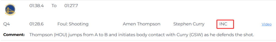 第一次漏判发生在距离比赛结束还剩1分28秒时,报告指出,火箭球员阿门-汤普森在防守库里投篮时,从A点移动到B点并主动与库里发生身体接触。这是一次漏吹的防守犯规,库里当时上篮命中,本该吹罚2+1,裁判没有响哨,库里少了一次罚球机会。这次漏判是勇士吃亏,火箭获利。