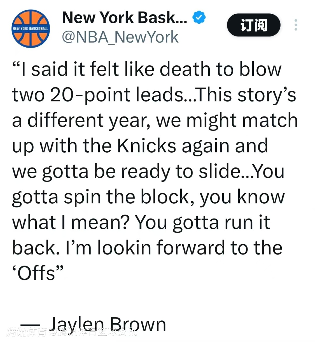北京时间4月7日,凯尔特人球星杰伦-布朗在直播节目中,谈及去年季后赛不敌尼克斯的经历。