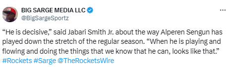 北京时间4月7日,火箭球员小贾巴里-史密斯在球队训练结束后接受媒体采访,谈及队友申京的表现。