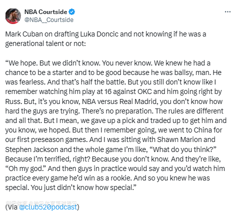 库班坦言,当初选中东契奇时,并不确定他能否成为划时代的天才球员:“我们当然抱有期待,但当时谁也说不准,未来本就无法预知。我们只知道,他有机会成为一名出色的首发球员,因为他球风果敢、无所畏惧,而这正是成功的一半。我至今还记得,他16岁时对阵雷霆的比赛,直接一步过掉了威斯布鲁克。”