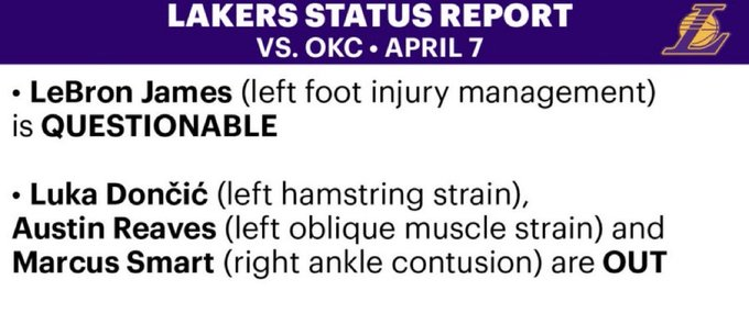 北京时间4月7日,NBA常规赛继续进行,湖人明日对阵雷霆。赛前,湖人方面更新球队伤情报告,斯马特、东契奇、里夫斯继续缺阵,詹姆斯出战成疑。