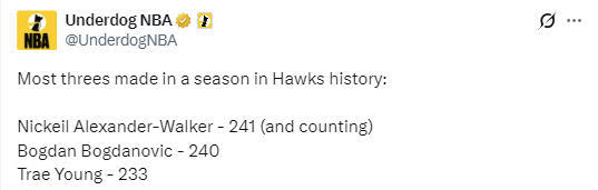 此前老鹰队单赛季三分球命中数纪录归属于博格达诺维奇,他曾在2023-24赛季命中过240记三分球。本场比赛之前,亚历山大-沃克已经投中237记三分球,距离超越博格达诺维奇仅差4球。