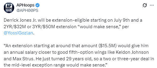 小琼斯在今年7月9日起将获得续约资格,Yossi Gozlan表示:“一份起薪在1550万美元左右的续约合同,将使小琼斯的年薪更接近凯尔登-约翰逊和斯特鲁斯这样的优秀第五选择侧翼球员。他刚满29岁,所以一份两到三年的中产特例合同是合理的。”