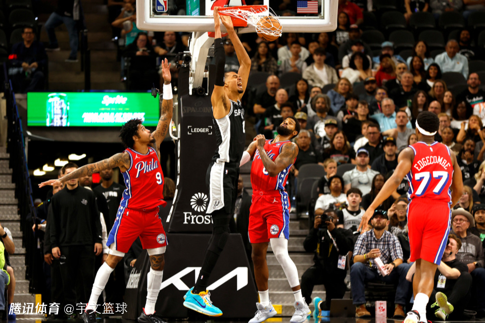 在没有文班亚马以后,马刺的防守强度直线下滑,被76人打出一波10-2的进攻高潮反超比分。但是马刺球员及时调整状态,成功提速用连续反击攻势予以回应,打出一波9-0的进攻高潮重新建立领先基础。不过76人还是多次抓住阵地机会追分,一度顽强地缩小分差到2分,布莱恩特和哈珀两大新秀连得5分,马刺带着7分领先进入第四节。