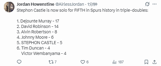 根据数据统计显示,这是卡斯尔职业生涯第5次砍下三双,他超越了邓肯和文班亚马,升至马刺队史三双榜第5位。目前排在卡斯尔身前的球员是约翰尼-摩尔,他在马刺生涯总计拿到过6次三双。马刺队史三双王是德章泰-穆雷,他在效力马刺队期间总计17次砍下三双。