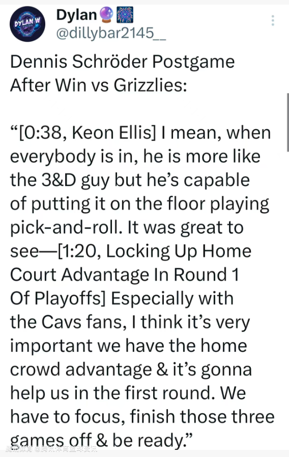 关于锁定季后赛首轮主场优势,施罗德表示:“尤其是考虑到骑士的球迷氛围,我认为拿下主场优势对我们来说非常重要,这会在首轮帮到我们。我们必须集中精力,拿下剩下这三场比赛,做好万全准备。”