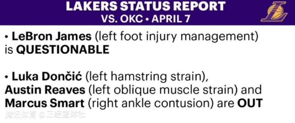 湖人队将于明天主场迎战雷霆队,他们在上周的交手中输掉了足足43分,而且东契奇和里夫斯在这场比赛中连续受伤。湖人官方发布了明日比赛的伤病报告。其中詹姆斯(左脚伤病管理)出战成疑,斯玛特(右脚踝挫伤)、东契奇(左腿筋拉伤)、里夫斯(左侧腹斜肌拉伤)缺席比赛。