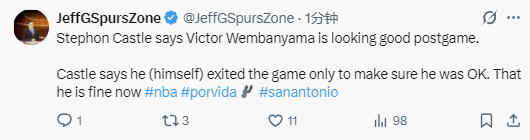 卡斯尔在谈到文班亚马的伤情时表示:“文班亚马的状况看起来不错。当文班亚马受伤离场后,全队每个人都必须站出来,整场比赛球队的竞争意识都非常强烈。”