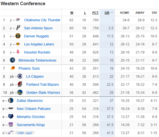 7-10名:太阳(43胜25负)、快船(40胜38负)、开拓者(40胜39负)和勇士(36胜42负)