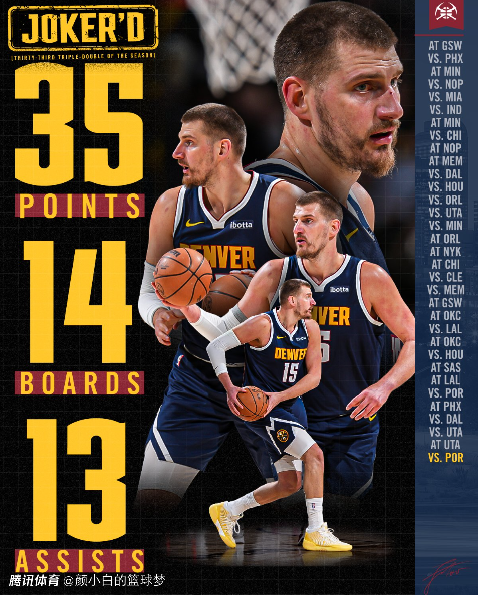 2.约基奇拿到本赛季第33次三双联盟第一;