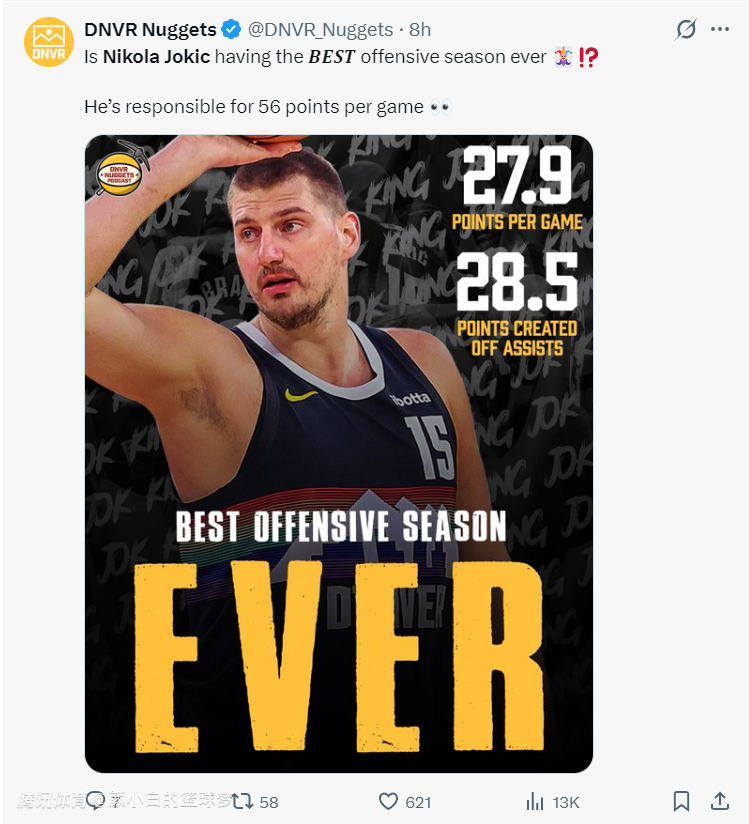 约基奇已经提前锁定了场均三双,他还有一项数据极为恐怖,他场均27.9分,但通过助攻场均可以帮助球队贡献28.5分,换言之约基奇本赛季场均要造56.4分,掘金本赛季场均121.1分,约基奇一人创造的得分占比全队46.6%十分炸裂。
