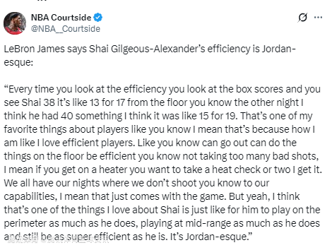 “但说实话,我最喜欢亚历山大的一点就是,他这么大量地在外线出手、这么频繁地打中距离,还能保持如此恐怖的效率。这真的很有乔丹的风范。”