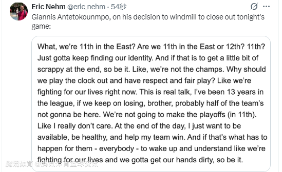 字母哥说道:“我们排在东部第11位,得继续找准自己的定位。如果这意味着在比赛最后时刻必须拼得更凶一点,那也只能这样了。我们又不是卫冕冠军,凭什么要耗完时间、讲什么所谓的尊重和公平竞赛?我们现在可是在为生存而战。我说的是真心话,我在联盟打了13年了,如果我们继续输下去,兄弟,这支球队恐怕得有一半人要卷铺盖走人。以第11的排名,我们根本进不了季后赛。