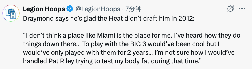 北京时间4月8日,近日,追梦在播客节目中谈到了自己很庆幸2012年选秀大会热火没有选他。