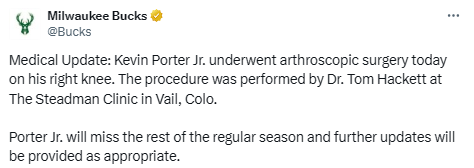 北京时间4月8日,雄鹿官方宣布,球队后卫小凯文-波特于今日接受了右膝关节镜手术。小波特将缺席本赛季剩余所有比赛,球队目前尚未确定其具体康复时间表。
