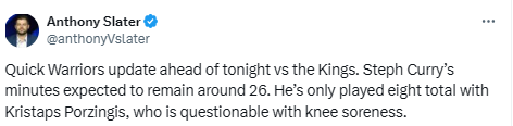 北京时间4月8日,NBA常规赛继续进行,勇士对阵国王。赛前,勇士队记Anthony Slater谈到勇士球星库里的出场情况。