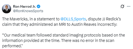 北京时间4月8日,独行侠官方发布声明,驳斥了此前湖人主帅雷迪克声称球队错误安排里夫斯进行核磁共振检查的说法。