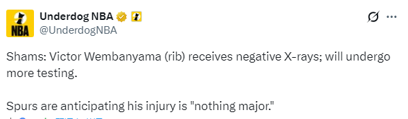 北京时间4月8日,文班亚马的伤情更新,据名记shams报道,文班亚马肋骨X光检查结果为阴性,无结构性损伤;据悉,文班将接受进一步检查,马刺预计他的伤势并不严重。