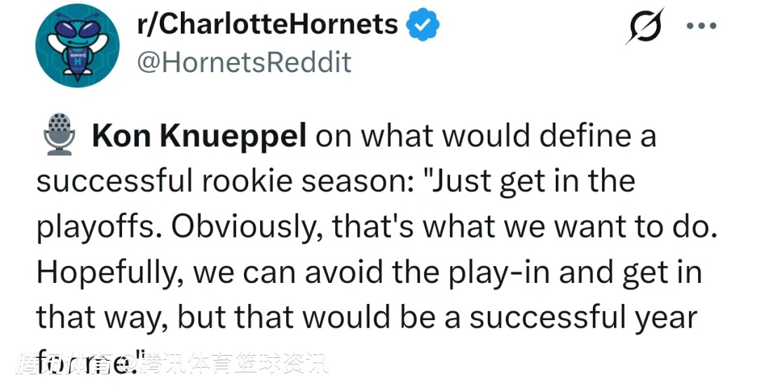 克努佩尔在谈及怎样才算一个成功的新秀赛季时说道:“只要打进季后赛就行。显然这是我们的目标。希望能不用打附加赛直接晋级,对我来说这就算成功的一年。”