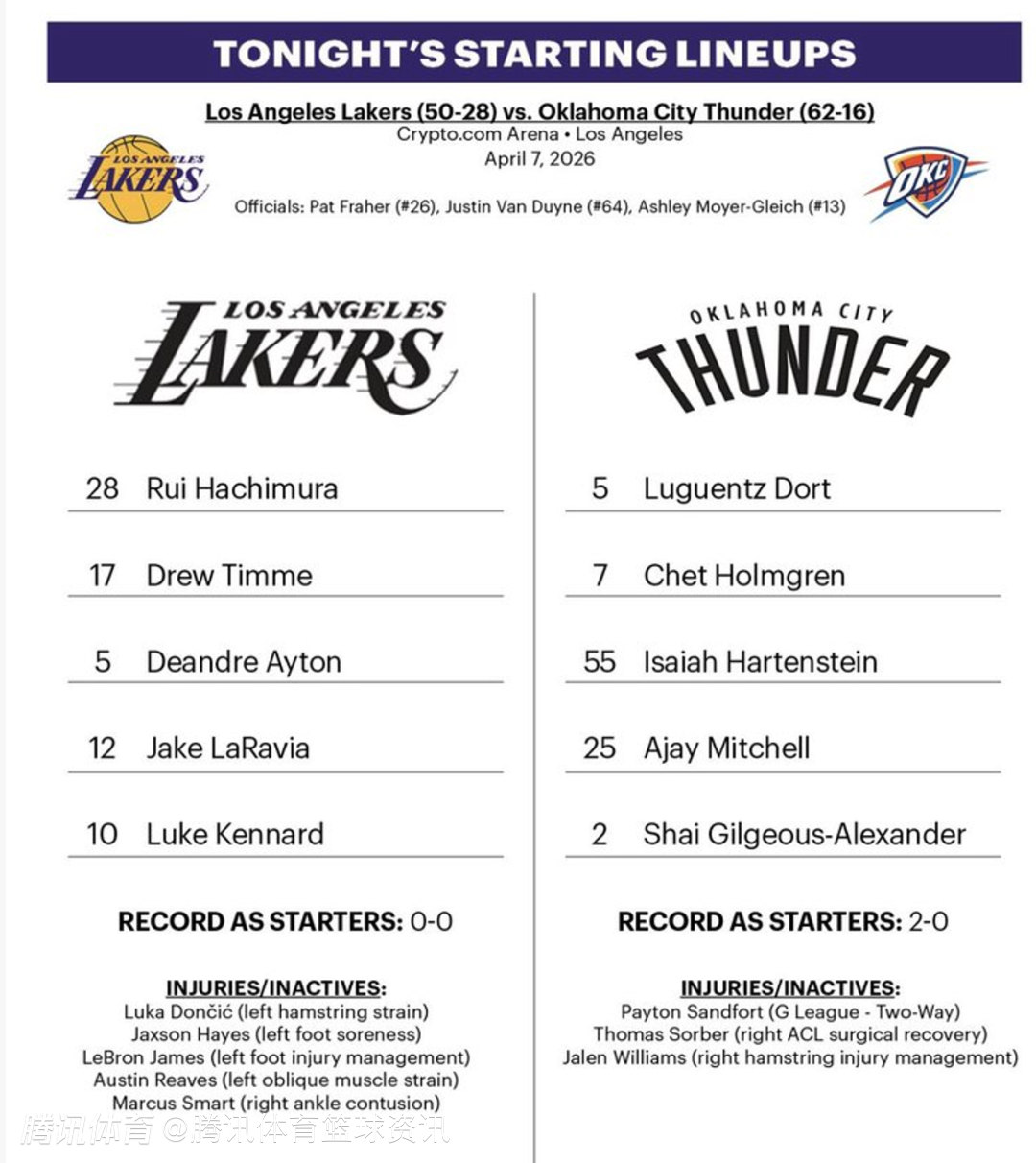 北京时间4月8日,今天上午10点30分,湖人主场对阵雷霆,赛前双方公布了本场比赛的首发名单。