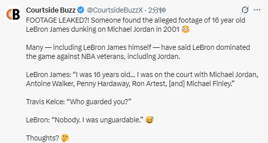 北京时间4月8日,外媒Courtside Buzz晒出了一段疑似詹姆斯16岁时隔扣迈克尔-乔丹的视频,这场比赛发生在2001年,而詹姆斯本人和慈世平都曾确认过这场球局的存在。