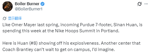 值得一提的是,普渡大学记者Boiler Burner此前也在社交媒体上晒出了郇斯楠参加耐克篮球峰会的照片(对位五星高中生,2026届全美最佳中锋阿拉凡-迪亚涅),以及他的扣篮视频,并点赞了郇斯楠的爆发力,还发文写道:“可以想见,教练已经迫不及待想让这位内线中锋到校报到了。”