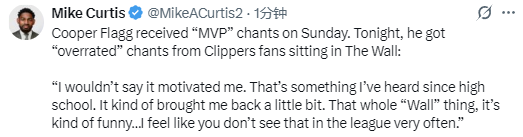 在谈到自己隔扣大洛之前是否听到快船球迷朝自己喊“被高估了”时,弗拉格说道:“是的,我不会说这些话激励了我。其实从高中开始,我就经常听到这种声音,所以这反倒让我有点梦回从前。全场一起喊的这种场面还挺有意思的,在联盟里并不常见,这真的把我拉回了高中时期的记忆里。”