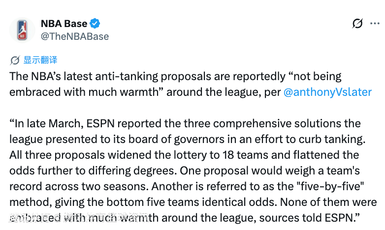 Slater表示:“3月底,ESPN曾报道联盟向董事会提交的三套全面反摆烂方案。三套提案均将乐透区球队扩至18支,并在不同程度上进一步拉平了选秀顺位的中签概率。其中一套提案将球队战绩的计算周期拉长至两个赛季;另一套则被称为‘五五开’方案,给联盟垫底的5支球队完全相同的中签概率。消息人士向ESPN透露,这三套方案在联盟内部均未获得热烈响应。”