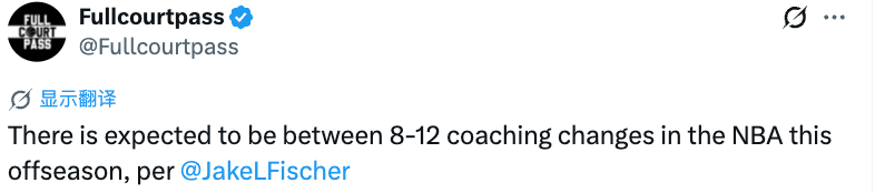 Fischer表示:“一位熟悉教练市场的联盟消息人士透露,最终会有8到12支球队更换主教练。”