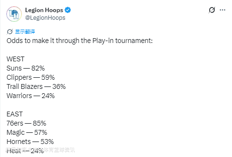 北京时间4月9日,附加赛晋级概率出炉,太阳和76人稳居前列,勇士和热火两队晋级概率仅24%,形势堪忧。
