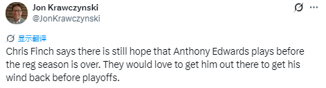 芬奇表示,爱德华兹仍有希望在常规赛结束前复出。球队希望他能在季后赛前登场找找比赛状态。本场比赛,爱德华兹因右膝伤病管理继续缺席,这将是他连续缺席的第三场比赛。