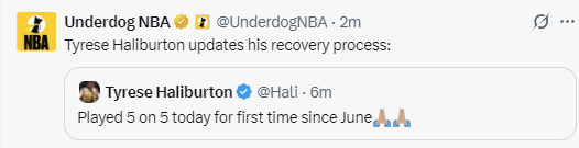哈利伯顿在去年总决赛第7场比赛中遭遇了右脚跟腱撕裂的重伤,导致他本赛季直接报销。而从去年夏天开始,哈利伯顿就开始了自己漫长的康复进程。