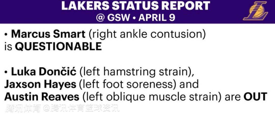 詹姆斯缺席了湖人队上一场对阵雷霆队的比赛,但他没有出现在湖人队对阵勇士队比赛的伤病报告当中,这意味着他将迎来复出。东契奇(左腿腘绳肌拉伤)、里夫斯(左腹斜肌拉伤)和海斯(左脚酸痛)将继续缺阵。