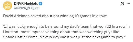北京时间4月9日,NBA常规赛继续进行,掘金队对阵灰熊队。赛前,掘金队主教练小阿德尔曼接受媒体采访,谈到了掘金队冲击10连胜的话题,并回忆当年在老阿德尔曼身边见证火箭22连胜的经历。