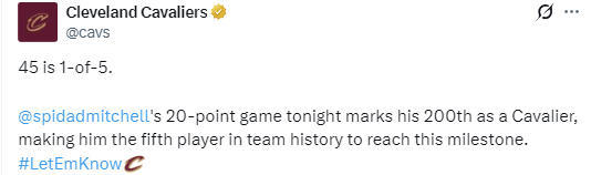 根据骑士队官方发布的统计显示,这是米切尔骑士生涯第200次单场得分20+,也是队史第5位能做到这点的球员。另外4位能做到这点的球员分别是勒布朗-詹姆斯(696次)、布拉德-多尔蒂(257次)、欧文(234次)、奥斯汀-卡尔(217次)。