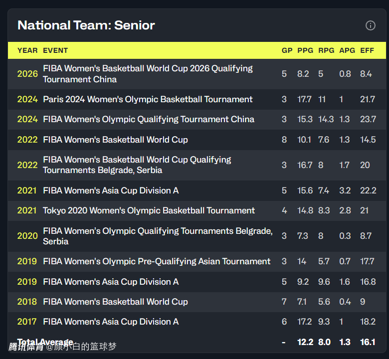 她刚刚在世预赛上帮助中国女篮拿到了直通德国世界杯的门票,五场比赛李月汝8.2分5篮板0.8助攻,命中率37%,首战拿到21+10的数据,而后的四场比赛她的表现有所下滑,因为宫鲁鸣指导给了陈明伶、张子宇更多的锻炼机会。