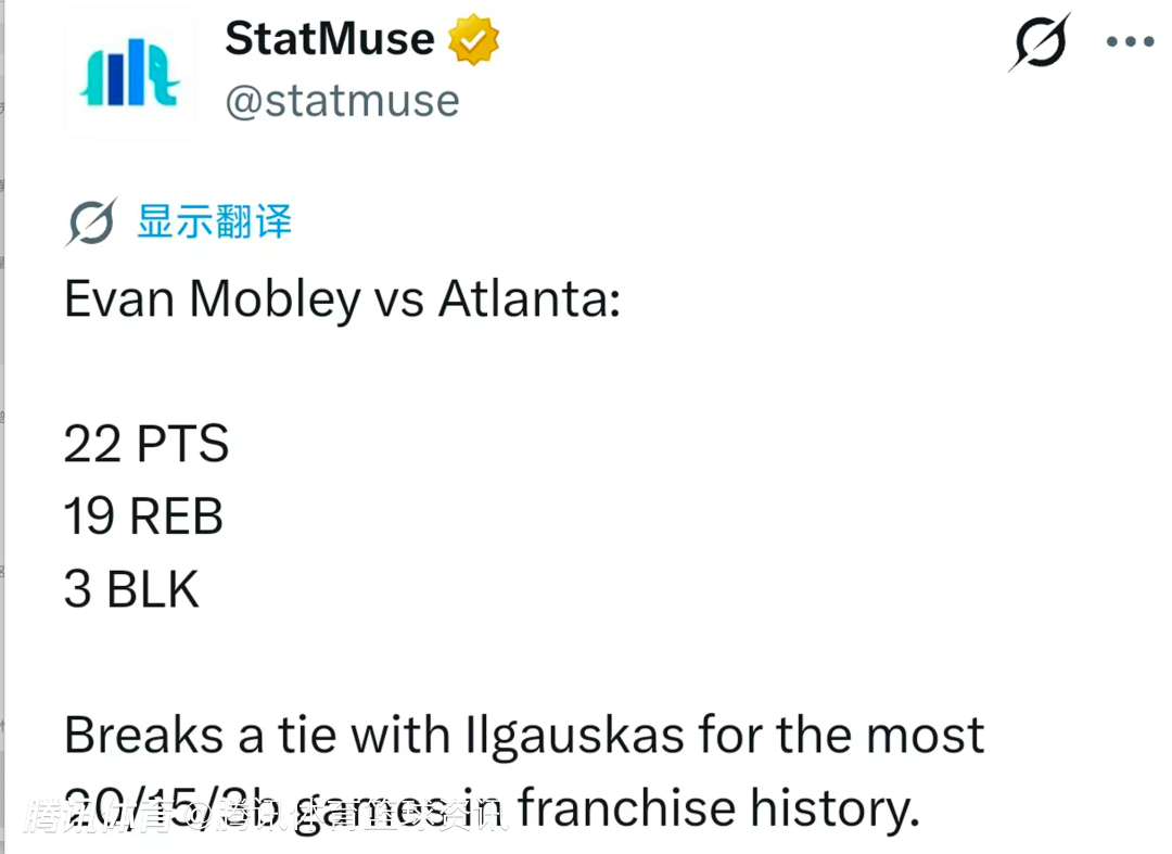 根据数据统计显示,凭借本场表现,莫布利篮板追平生涯纪录。他上一次抢到19个篮板是在2023年11月29日,当时的对手也是老鹰。
