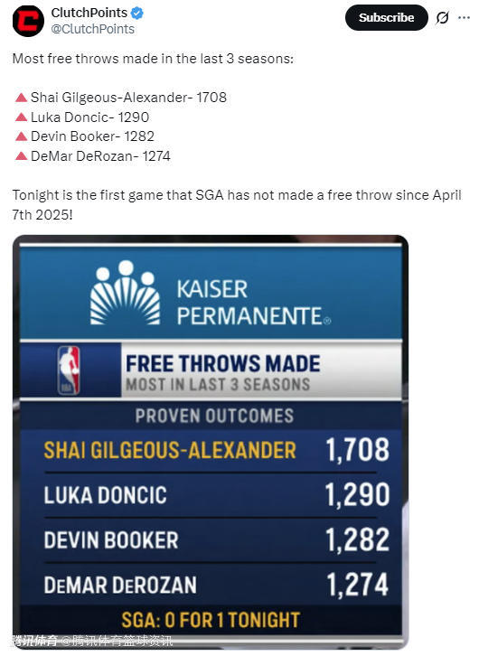 在过去3个赛季中,亚历山大是全联盟命中罚球数最高的球员,他总计命中1708个罚球,远超第二名的东契奇。