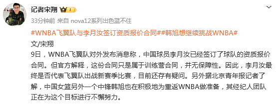 北青记者宋翔发文表示:中国女篮另外一个中锋韩旭也在积极地为重返WNBA做准备,其经纪人团队正在为这个目标进行不懈努力。