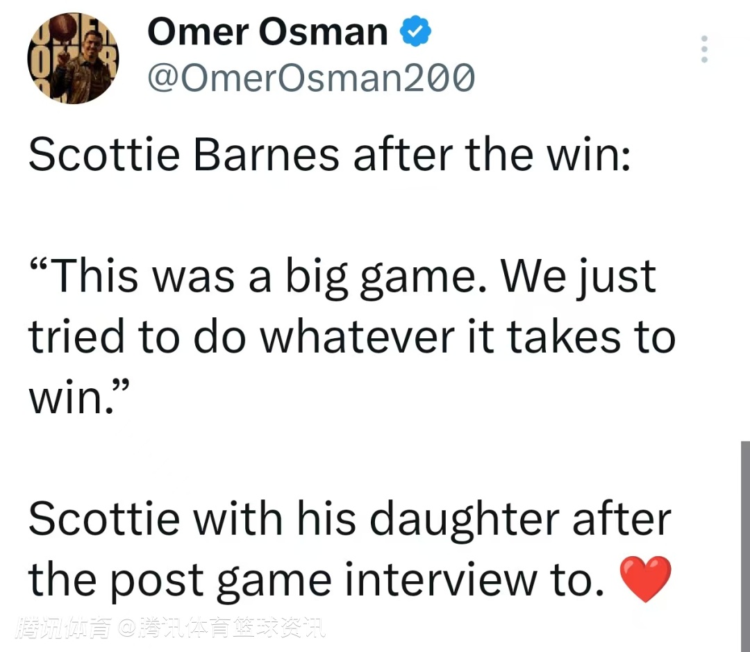 巴恩斯:这是硬仗,我们就是全力以赴争胜。抢进攻篮板、找准站位、跑战术、造错位得分,怎么能赢就怎么打。我觉得我们把二次进攻得分、篮板拼抢都做好了,末段执行也很到位。