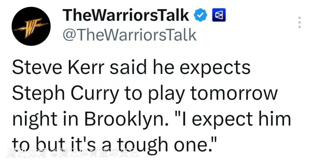 科尔还预计库里明日客战篮网会上场,他说道:“我预计库里能打,但这确实得谨慎考量。”
