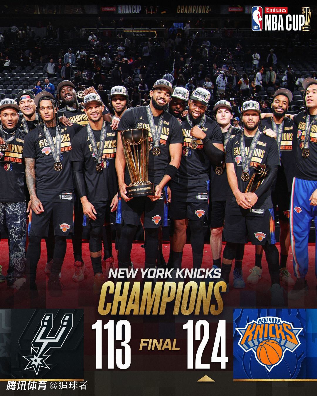 谈到夺得杯赛冠军的感受,唐斯表示:NBA杯很特别,你看看在拉斯维加斯举行的半决赛和决赛,它们激发出了各支球队最好的一面。我们赢了,穿上了冠军T恤,上面写着Knicks,这是一项荣誉。我们今晚肯定会庆祝,会把它深深地记在心里,然后现在开始要为拿第二个奖杯(总冠军)努力。