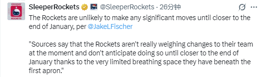 北京时间12月29日,根据NBA记者Jake Fischer报道,火箭队当下不会考虑进行重大引援,至少要到1月底才可能会有交易动作。