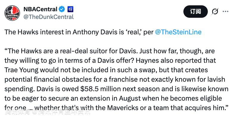 Stein表示:“老鹰确实是浓眉的潜在追求者之一,但问题在于,他们愿意为得到戴维斯开出多大的筹码?特雷-杨不会被纳入这笔交易,但这给老鹰队带来了潜在的薪资难题,毕竟这支球队并不以高额投入著称。”