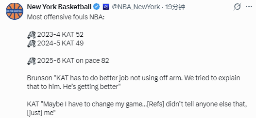 在过去的两个赛季,唐斯都是联盟进攻犯规次数最多的球员,在2023-24赛季他被吹罚了52次进攻犯规,2024-25赛季则是49次进攻犯规。而本赛季,唐斯进攻犯规过多的问题更加严重,按照现有频率打到赛季结束,他将会出现82次进攻犯规。