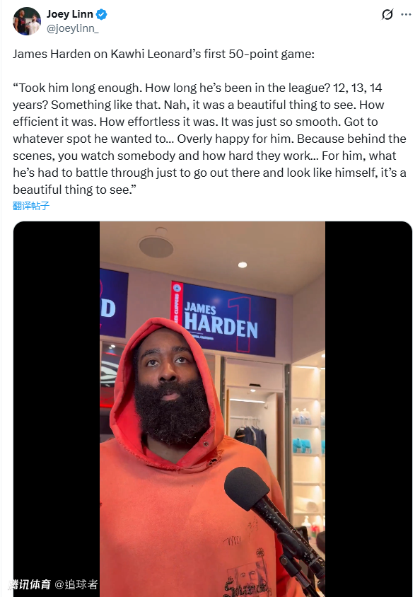 哈登则表示:他可是等得够久的。他进联盟多少年了?12、13、14年?差不多吧。见证这样的表演真是太美妙了,他是如此高效,看着非常轻松,动作行云流水。能在场上随心所欲去到想去的任何位置。