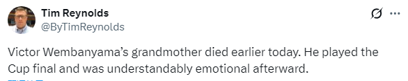 上一场马刺淘汰卫冕冠军雷霆,文班亚马复出首战便打出外星人般的统治力,为何文班亚马会在决赛中迷失?其实,文班能够忍着悲伤坚持出战已经实属不易。据名记Tim Reynolds报道,文班亚马在今天早上(当地时间)得知他的祖母在法国去世,即使如此,他仍然坚持打完比赛。