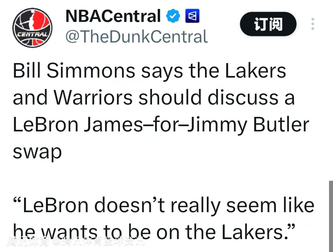 北京时间12月30日,名嘴比尔-西蒙斯在直播节目中建议,湖人和勇士应当商讨一笔用詹姆斯交换巴特勒的交易,因为詹姆斯看起来是真的不想待在湖人了。