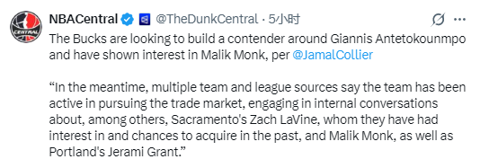 Collier透露:“多位球队及联盟消息人士表示,雄鹿近期在交易市场上动作频频,管理层已展开内部磋商,目标球员包括国王队的拉文与蒙克,此外还有开拓者队的格兰特。值得一提的是,雄鹿此前就对拉文抱有兴趣,且曾有机会将其招致麾下。”